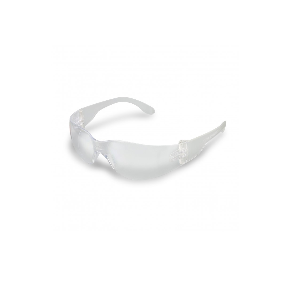 Óculos de proteção, com armação e visor confeccionados em uma única peça de policarbonato incolor, amarelo, cinza, verde,incolor com revestimento externo de filme prateado, cinza com revestimento externo de filme prateado e verde escuro tonalidade 5, componte e apoio nasal injetado na mesma peça e hastes tipo espátula. As hastes são confeccionadas do mesmo material da lente e articuladas nas extremidades do visor por meio de parafusos metálicos.